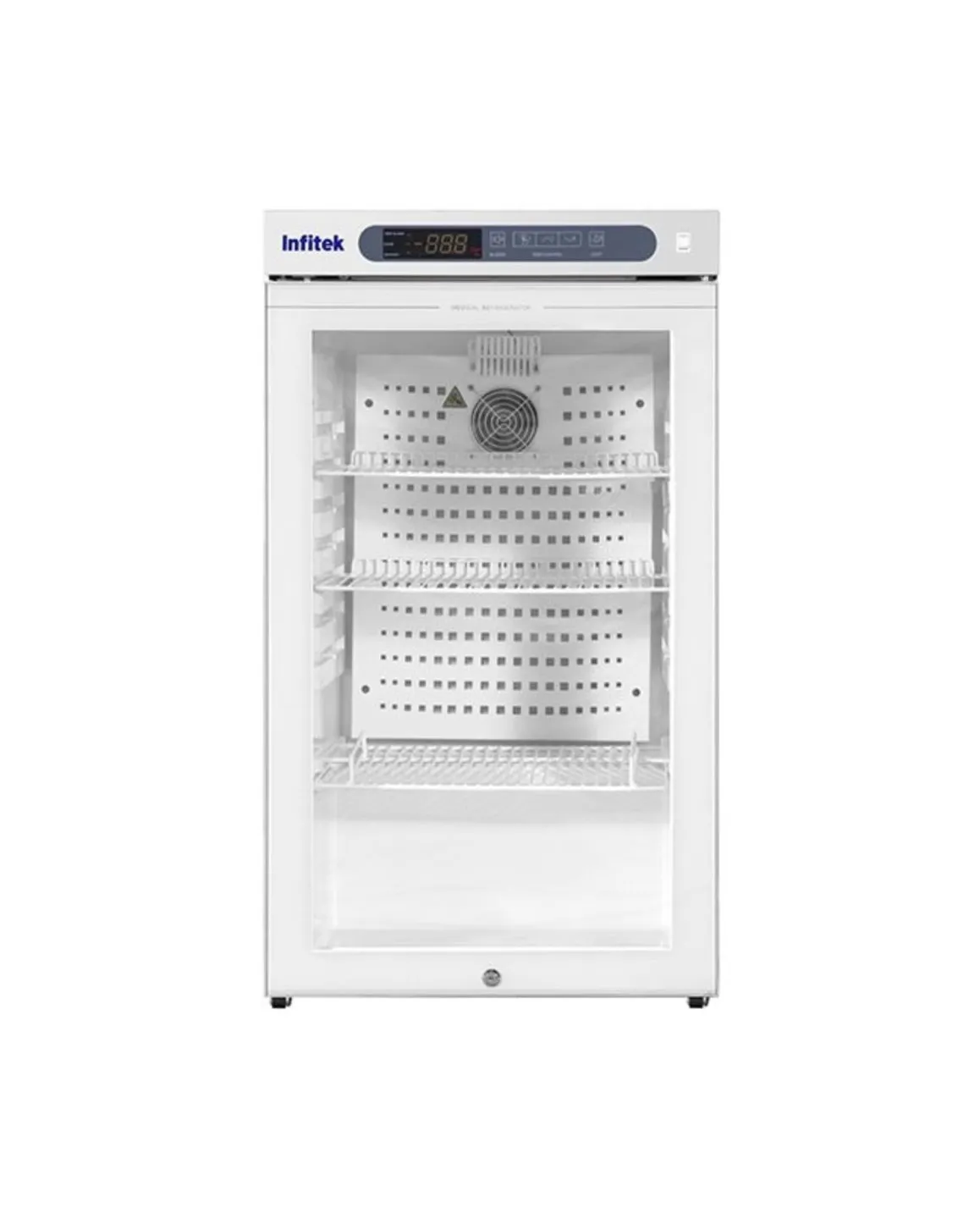 Refrigerator from Infitek equipped with a complete temperature alarm system for high/low temperature, power failure, and door ajar. Features a forced-air cooling system for stable temperature control and adjustable shelving to securely store vaccines, pharmaceuticals, and medical supplies.
