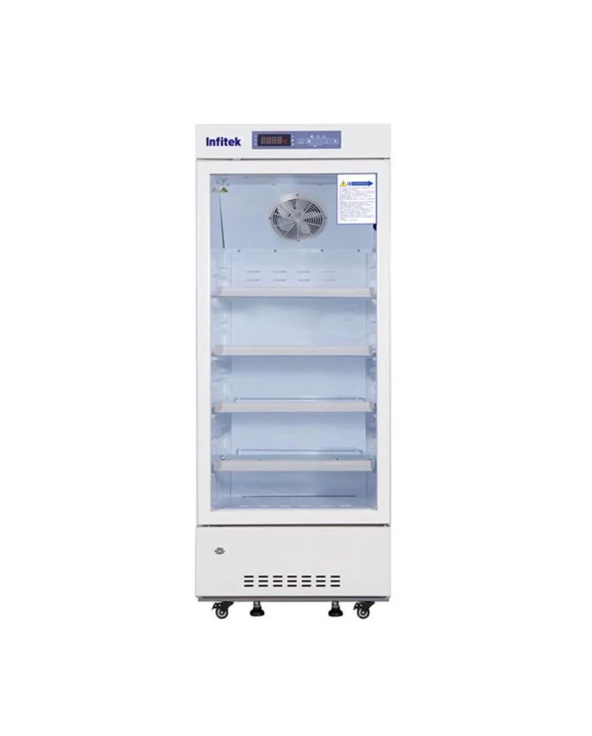 Pharmaceutical Refrigerator from Infitek equipped with a complete temperature alarm system featuring audible and visual alerts for high/low temperature, power failure, and door ajar. Features a forced-air cooling system for stable temperatures and adjustable shelves to safely store vaccines, drugs, and reagents.