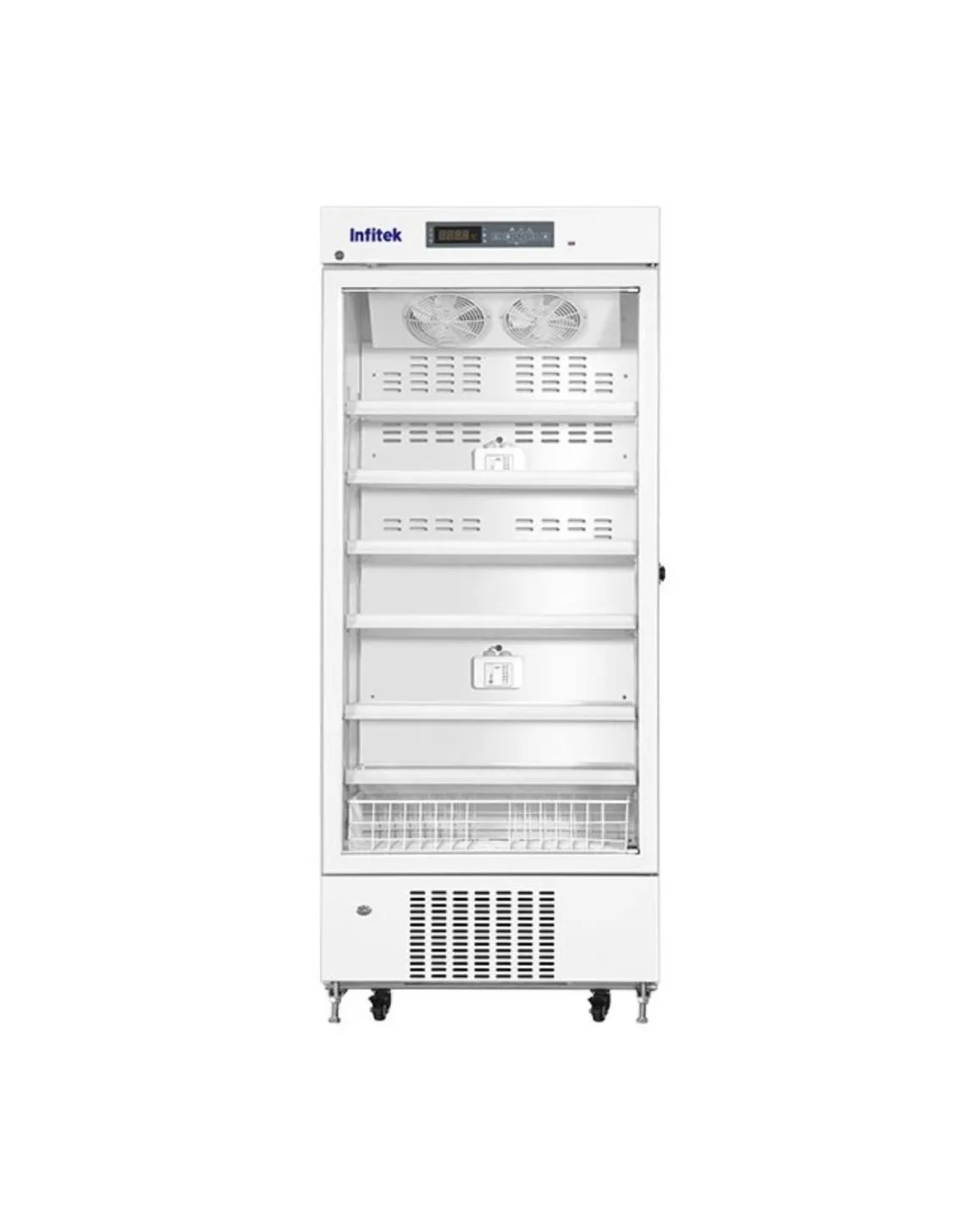 Pharmaceutical Refrigerator from Infitek equipped with a complete temperature alarm system featuring audible and visual alerts for high/low temperature, power failure, and door ajar. Features a forced-air cooling system for stable temperatures and adjustable shelves to safely store vaccines, drugs, and reagents.